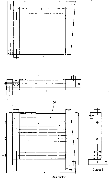 The bottom of the lower reservoir must be slightly inclined towards the draining plug. The volume of the collection tank should be about 10 liter. In cold ambient temperature part of the heat exchanger and the pipe between the cooler and the ICE can be thermally insulated to prevent the gas from cooling too much. In a vehicle the cooler can be installed in the front of the radiator to ensure proper fresh air flow through the cooler. The cooler must be designed so that the total area of all the cooler pipes is equal or greater than the area of the incoming pipe. The cooler pipes can be aligned in two or three rows.