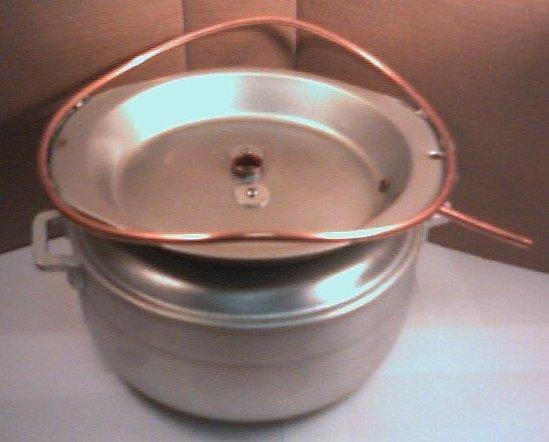 In one rendition the lips around the edges were bent up to hold the top pot into the same position each time it was set on it. Another way was to solder a .25” copper tubing, making a circle, to the pie pan. This keeps the top pot from sliding off. See photo at top.