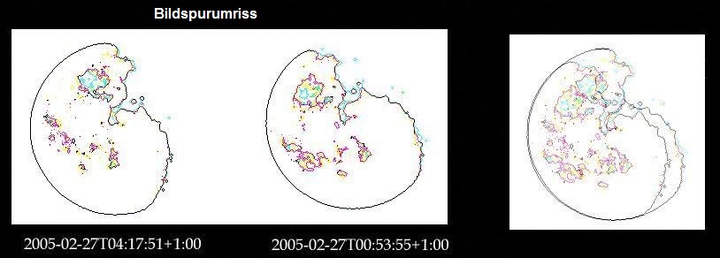 Immer wieder sind da Beiträge über die Rotation des Mondes auf einer Nachtreise gewesen, aber niemand scheint je eine Kamera zur Hand zu haben. Also ich hatte letzte Nacht das Glück von einem klaren Himmel. [27. Feb], also nahm ich meine Billig-3,3-Megapixel mit 10x optischem Zoom und knipste ein paar Bilder vom Mond. Zuerst um 0.55 Uhr mitteleuropäischer Zeit, das zweite um 4.17 Uhr mitteleuropäischer Zeit im Osten der Niederlande. Beide Bilder wurden mit einer horizontal gehaltenen Kamera aufgenommen und einem 10x optischen Zoom. Ich nahm die 2 Monde, die Bilder volle Pixelgröße vom Kamerabild, und machte heute eine Zusammensetzung, und machte etwas Bildbearbeitung, um die Eigenschaften des Mondes aufzuklären und solche Sachen. Die rapide Rotation kann klar gesehen werden. http://www.rumormillnews.com/cgi-bin/forum.cgi?read=65862 [Anmerkung: extreme Rotation des Mondgesichtes ist monatelang bemerkt worden, und zeigt an, dass die Erde sich unter dem Mondorbit neigte.]