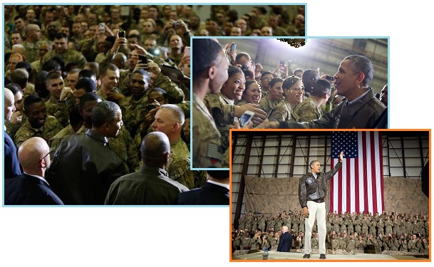 Cheers erupted among the hundreds of U.S. troops gathered in a Bagram hangar. With Afghanistan immersed in a runoff election to choose a successor to President Hamid Karzai, Obama did not meet Afghan government officials nor travel to the capital Kabul. Obama's visit to Bagram took place late on Sunday night local time. He was joined by national security adviser Susan Rice and senior adviser John Podesta, who has a son stationed in Afghanistan.