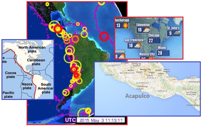 In addition to S America rolling over the Nazca Plate, causing the Chile Calbuco volcano to explode without warning, The bowing of the N American Plate is forcing southern Mexico over the Cocos Plate. The high waves that rolled into Acapulco and along the coastline to El Salvador and Guatemala on May 2, 2015 were not as a result of a quake, thus were not considered a tsunami. They were not as a result of a storm, as there was no storm anywhere in the region. The weather was clear. They were as a result of southern Mexico moving over the Cocos Plate, forcing the water to distribute in all directions. To those on land, this was a silent and unexpected adjustment.