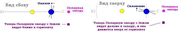 При определении местонахождения Земли относительно созвездий нужно учитывать вид с Земли. Если Земля приостановлена на ее орбите в точке для 25 декабря, так как Планета X находится перед нею, блокируя ее путь, то при НАКЛОНЕ вперед Полярная Звезда оставалась бы в положении севера, но подвинулась бы ближе к горизонту. Это показано ниже, на виде сбоку. СКЛОНЕНИЕ к Планете X привело бы к тому, что Полярная Звезда и располагающиеся относительно нее созвездия выглядели бы сдвинутыми к ЗАПАДУ. Это показано ниже, на виде сверху.