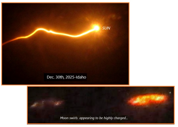 31.12.2025: Это дуга от Солнца к заряженному хвосту Нибиру. Обычно хвост скрыт отблесками Солнца, но с солнечными фильтрами эти блики уменьшаются, что позволяет рассмотреть детали. Эти дуги тянутся к Земле в двух измерениях, а Нибиру находится на орбите Венеры, поэтому дуги видны и находятся близко. Нибиру находится ниже Солнца, но вращается в обратном направлении (по часовой стрелке), поэтому хвост смещается влево. Мы предсказали возникновение молний между Нибиру и Землёй во время прохождения.