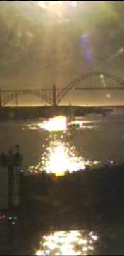 note that where the pier breaks the Sun's reflection, there is a second reflection closer to the bridge with no reason for a break. As the Sun rises, it's reflection merges with this second light source reflection. When the Sun appears, it looks elongated, occulted.