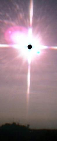 As the rising Sun moves from left to right and higher in the sky, the personas show their independence from the Sun. In the first three photos, the White Persona and Red Persona are seen at 10 o'clock, and Red Cross personas can be seen across the Sun at 4 o'clock. Under welder's lens in the next 3 photos, the Comet persona with the fan tail comes visible, more pronounced than just a few days ago. In the next photo, the White and Red personas have separated, one at 11 o'clock and apart from the Sun, the other at 10 o'clock and attached to the Sun, with the Red Cross persona also separating from the Sun. In the final unfiltered photo, the reason for the intensity of the Sun can be seen, as these personas are lost in the glare of the Occulted Sun.