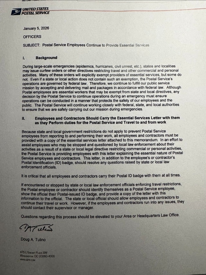 This is a letter given to all postal employees. It seems to be regarding some upcoming civil unrest. Is this real and preparing for a large event? [and from another] Trump Warns he May Go ‘Hard Way’ on Greenland January 10, 2026 https://www.rt.com/news/630777-trump-go-hard-greenland/The Greenland saga, which first caught the spotlight during Trump’s first term, has become a major source of tension between the US and European NATO members.Danish Prime Minister Mette Frederiksen has warned that any US military attack on another NATO country would mean “everything stops,” while leaders in Europe have stressed that “Greenland belongs to its people.” the US was mulling a plan to send each Greenlander between $10,000 and $100,000 to convince them to support America’s bid [and from another] Trump Eyes Striking Mexican Cartels January 9, 2026 https://www.thecentersquare.com/national/article_b27cd11c-6f1a-4f98-8d48-7eaf68afa89d.html The Trump administration has been busy carrying out over two dozen strikes on suspected narco-terrorists operating marine vessels in the Caribbean and eastern Pacific, leading up to last weekend’s massive air strikes on Venezuela and the capture of deposed Venezuelan President Nicolas Maduro. Sheinbaum has been intimidated by the cartels. Mexico has been accused of being a major passageway for the trafficking of the deadly drug fentanyl, among others. [and from another] Insurrection Act of 1807 https://en.wikipedia.org/wiki/Insurrection_Act_of_1807 The Insurrection Act of 1807 is the U.S. federal law that empowers the president of the United States to nationally deploy the U.S. military and to federalize the National Guard units of the individual states in specific circumstances, such as the suppression of civil disorder, of insurrection, and of armed rebellion. [and from another] What is the History Behind the Unofficial USPS Motto? https://uspsblog.com/how-is-new-york-city-related-to-famous-postal-quote/ While the Postal Service has no official motto, the popular belief that it does is a tribute to America’s postal workers. “Neither snow nor rain nor heat nor gloom of night stays these couriers from the swift completion of their appointed rounds”— is not the official Postal Service motto though it appears chiseled in gray granite over the entrance of the James A. Farley building at Eighth Avenue and 33d Street in Manhattan.