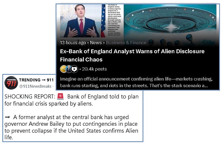 Bank of England must Plan for Financial Crisis Sparked by Aliens January 16, 2026 https://www.thetimes.com/uk/scotland/article/bank-of-england-must-prepare-for-ufo-announcement-f3mh8l9vh The Bank of England must plan for a financial crisis being triggered by an official announcement confirming the existence of alien life, one of its former policy experts has claimed.  A declaration of that magnitude would send shockwaves through the markets and could trigger bank collapses and civil unrest. [and from another] Seriously— is US about to announce alien life??? Emergency meeting in UK to prepare for possible market collapse https://www.godlikeproductions.com/forum1/message6127722/pg1 [and from another] UFO Whistleblower Claims Trump was 'Fully Briefed' on Alien Hybrids Living Among Humans December 8, 2025 https://www.dailymail.co.uk/sciencetech/article-15363981/UFO-whistleblower-Donald-Trump-evidence-non-human-intelligence.html In a recent interview, whistleblower and retired US Air Force Major David Grusch claimed that Trump has received reports on crashed spacecraft and non-human remains retrieved by the US, the origins of these beings, and their intentions. Grusch, a current advisor to Congress's UAP Task Force, said the president could soon become the 'most consequential leader in world history' by publicly disclosing what America has kept hidden about extraterrestrials. [and from another] Trump to Announce 'Most Important Revelation in Human History' on 79th Anniversary of Roswell UFO Crash January 16, 2026 https://www.ibtimes.co.uk/trump-announce-most-important-revelation-human-history-79th-anniversary-roswell-ufo-crash-1771539 British documentary maker Mark Christopher Lee claims Donald Trump has already written a speech confirming alien contact that will be delivered during the 2026 World Cup.